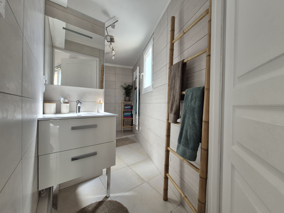 PIERREFEU DU VAR - Proche du centre du village, dans copropriété sécurisée, au dernier étage, bel appartement traversant de type 3 d'une surface de 56.81m² comprenant : entrée, séjour avec son espace cuisine équipée et aménagée orienté Sud Est, une 1ère chambre avec placard donnant sur un balcon avec une vue dégagée, un bureau (actuellement une chambre d'enfant) ouvrant sur le balcon, une buanderie, et une salle d'eau avec WC. Un escalier interieur donne accès à une mézzanine de 13.37m² avec placard de rangement. Le tout en parfait état. Une cave et une place de parking interieure complète l'ensemble. Corpropriété de 45 lots dont 20 à usage d'habitation, charges mensuelles 131€ comprenant l'eau froide, les parties communes, l'ascenseur. Taxe foncière 2024 est de 1042 €.